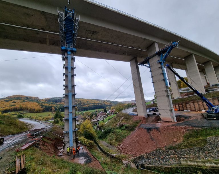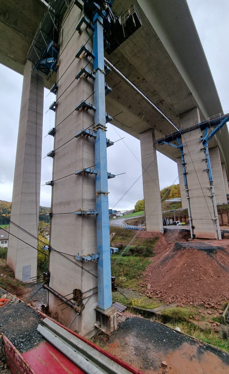 Wir prüfen diesen komplexen Rückbau in Zusammenarbeit mit Prof. Martin Mensinger (Mensinger Stadler Ingenieure) in statisch-konstruktiver Hinsicht. Nachdem die Vorbereitungen an den Pfeilern VI, VII und VIII größtenteils abgeschlossen sind und das Randfeld bereits konventionell abgebrochen wurde, kann in Kürze das Verfahren der Vorschubrüstung zum Rückbau des zweiten Feldes erfolgen. Im Anschluss erfolgt der Ersatzneubau an gleicher Stelle.