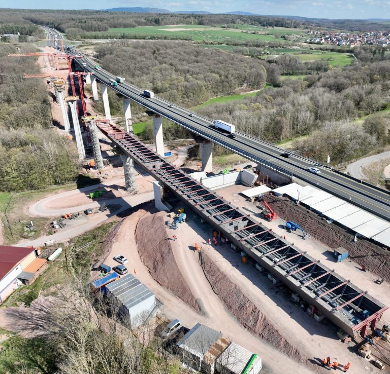 Abschnitt für Abschnitt wandert auch das zweite Teilbauwerk der Aurachtalbrücke auf der A3 nahe Herzogenaurach durchs Tal. Im Zuge des ÖPP Projektes A3 Nordbayern stellt das zukunftsfähige Bauwerk einen wichtigen Bestandteil des 6-streifigen Ausbaus zwischen Erlangen und Würzburg dar: Hergestellt mittels bodengestützer Vorschubrüstung, ausgeführt als zweistegiger Sannbeton-Plattenbalken und mit 296 m das längste Bauwerk des Ausbauabschnittes.