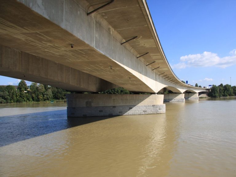 Neben der statisch-konstruktiven Prüfung der Nachrechnung der Donaubrücke Winzer (St 2125 zwischen Hengersberg und Osterhofen) führen wir aktuell auch die Nachrechnung der 675 m langen Innbrücke Suben auf der A3 am Grenzübergang zu Österreich durch. Zudem wurden von uns in diesem Jahr bereits die 190 m lange Amperbrücke Langenbach (Landkreis Freising) sowie die 305 m lange Brücke über das Mühltal (A6 Nürnberg – Amberg) nachgerechnet. Die Nachrechnung erfolgt dabei nach Stufe 1 und 2 der Nachrechnungsrichtlinie und unter Berücksichtigung zusätzlicher Betrachtungen, wie beispielsweise dem Ermüdungslastmodell ELM4.