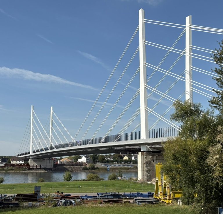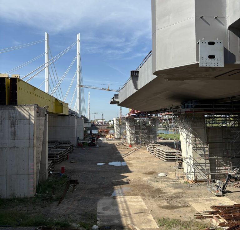 Aktuell befinden wir uns in den finalen Zügen der statisch-konstruktiven Prüfung der Unterbauten für die Strompfeiler der Brücke, auf denen später die Errichtung der bis zu 70 m hohen Pylone zum Befestigen der imposanten Schrägseile für das 380 m lange Hauptfeld über den Rhein erfolgt. Gleichzeitig schreitet der Einschub der Überbauten von beiden Rheinseiten zügig voran, während mit entsprechendem Vorlauf die weiteren Pfeilerachsen im Vorlandbereich hergestellt werden.